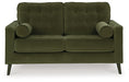 This loveseat strikes the perfect balance between elevated and eclectic. Contemporary lines and a richly hued velvet upholstery keep things chic. Design details like button tufting and splay legs add mod flair. It’s sure to keep your living room luxuriously on trend—at a price that won’t break the bank.