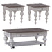 Create a calm and peaceful oasis with the River Place three piece set. Crafted with Pine solids and veneers, this set features a heavily distressed two-tone Riverstone White and Tobacco finish and includes the cocktail table and two end tables. The cocktail and end tables each have one full extension drawer with wood framed drawer fronts and bead molding accented by Antique Pewter knob hardware. The tops have a high-low veneer pattern for textural interest. All tables feature heavy, multi-turned legs, with the cocktail table having an open bottom shelf for additional storage or display items, and casters for easy mobility. The River Place three piece set strikes the perfect balance of life on the coast and a comfy home tucked away in the hills.