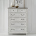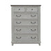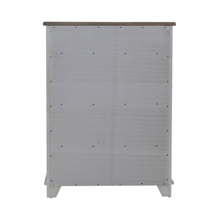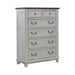 Create a room of your own that provides the perfect start and end to every day with the River place 6 drawer chest. Crafted with excellence using Pine solids and veneers, this chest features a heavily distressed two-tone Riverstone White and Tobacco top finish. The wood framed drawer fronts, along with the framed end panels and top, feature a high-low veneer pattern for textural interest. The drawers feature full extension soft closing drawer guides for an elegant touch, with the top drawers offering premium felt lining and the bottom drawer with a beautiful cedar panel. Wide pilasters flow into angled block feet to complete the farmhouse styling with a timeworn feel that we all know and love. The custom Antique Pewter bail pull and knob hardware accent the River Place 6 drawer chest to help create an inviting, airy atmosphere in your home while providing comfort in your own private getaway.