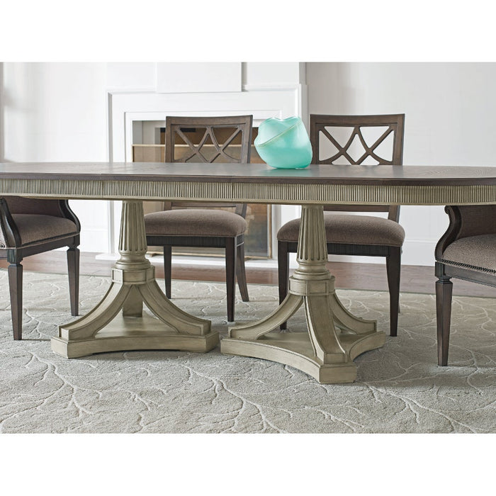 Friedrick dining table is great for any dining room it will extend from 84" to 124" with two 20" leaves. The versaille finish shaped pedestal bases and contrasting geometric marquetry veneer pattern top in the mocha elm finish. A reeded apron rail will make this a elegant table for any dining area.