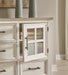 Details Includes dresser and mirror, Made with hardwood solids, veneers and MDF substrates, Two-tone finish (antiqued white and light gray wood tone), Dark bronze-tone bar pulls, 2 glass-front cabinets, each with single storage shelf, 5 drawers with fully finished interior, dovetail construction and heavy duty ball-bearing side glides (top drawer felt lined), Mirror attaches to back of dresser