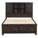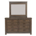 Enhance your home with the Thornwood Hills king bookcase bed, dresser, and mirror. Crafted of rubberwood solids with mango veneers, this kit features a rock beaten grey finish with saw cuts, straight line cases with wide pilasters and block feet, metal strip accents, planked tops and side panels, wood framed drawer fronts, full extension drawers with felt lined top drawers, and is accented with dark antique pewter hammered metal bar pull hardware. This unique bookcase bed features a headboard with adjustable shelving for display and storage with wire management access holes in the back panel and a storage footboard complete with two drawers. The dresser features eight drawers of storage, and pairs well with the wood framed mirror that features a beveled edge. Attach the mirror to the dresser with the included bolt-on supports. Add this unique bedroom set to your traditional style home.