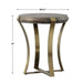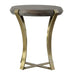 Plated brushed brass legs suspend the top of the Unite side table in acacia veneer with a dark walnut stain washed with a light gray glaze.