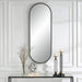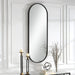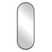 This iron oval features a sleek satin black finish and linear details. May be hung horizontal or vertical.