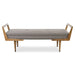 A bench for extra seating with a mid-century twist in its modern birch wood frame lightly finished in a smooth oak finish, with a tufted bench seat in a woven taupe-gray fabric.