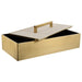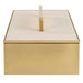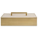 A classic silhouette with modern touches, this metal box is finished in a classic brass and covered with a lift-off lid finished in a white faux shagreen with brass handle.
