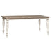 Design possibilities are endless with the Whitney six-piece rectangular table set. Crafted of rubberwood solids with oak veneers, this set features an antique linen finish with weathered gray tops and consists of the leg table, four slat back side chairs, and a bench. The table has a planked top with a 14 inch removable leaf that is anchored by heavily turned legs. The slat back side chairs have a padded upholstered seat in a linen fabric with a turned cap rail and turned front legs with nylon chair glides to protect your flooring. The bench has a turned cap rail with turned splayed legs and a padded upholstered seat in a linen fabric. The antique linen and weathered gray finishes give the Whitney collection an heirloom quality.